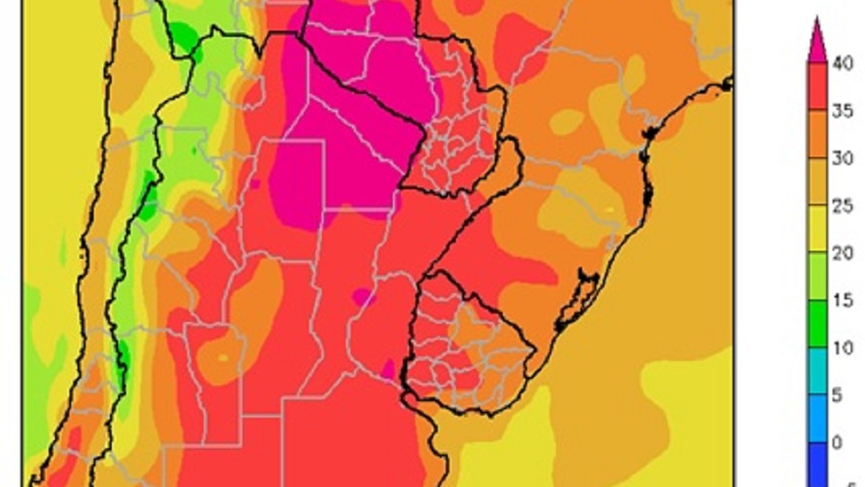 • El centro del NOA, el este de Cuyo, la mayor parte de Corrientes, el oeste de Misiones, la mayor parte de Santa Fe, la mayor parte de la Región Pampeana, el noroeste y el sudeste del Paraguay y el oeste del Uruguay observarán temperaturas máximas ente 35 y 40°C.