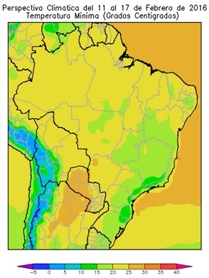 El norte y el centro-oeste del área agrícola brasileña, observará temperaturas mínimas superiores a 20°C, con algunos focos con valores inferiores. El sur de Pará, el sur Piauí, el sudeste de Tocantins, la mayor parte de Bahía, Goiás, Mina Gerais, Paraná, Sao Paulo, Río Grande do Sul y el oeste de Santa Catarina, observará temperaturas mínimas inferiores a 20ºC.