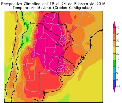 El sudeste del Paraguay, el centro del NOA, la mayor parte de Cuyo, el norte de la Mesopotamia, la mayor parte de la Región Pampeana y la mayor parte del Uruguay, observarán temperaturas máximas superiores a 35°C. Con un foco con temperaturas superiores a 40ºC, que se ubicará sobre el este del NOA, la mayor parte del Paraguay, la Región del Chaco, el norte de Córdoba, la mayor parte de Corrientes, de Santa Fe, Entre Ríos, el norte de Buenos Aires y el oeste del Uruguay.
