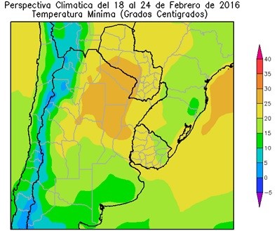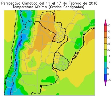 La mayor parte del Paraguay, el centro del NOA, el oeste de la Región del Chaco, la mayor parte de la Mesopotamia, el norte de Cuyo, el norte de Córdoba, el sur de Santa Fe y la mayor parte del Uruguay, observarán temperaturas mínimas superiores a 20ºC, con un foco con temperaturas superiores. El centro-este del NOA, la mayor parte de Cuyo, el norte de la Mesopotamia, la mayor parte de la Región Pampeana y el nordeste del Uruguay entre 15 y 20ºC.