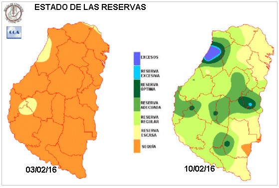 En el mapa aparecen zonas que han logrado reservas adecuadas y se posicionan con ventajas respecto de otros sectores de la provincia. En Nogoyá se destaca la interrupción de una extendida lengua de reservas que alcanzaron niveles adecuados y puntualmente óptimos. Por otra parte el extremo sudeste provincial es el que ha quedado más postergado, aunque las reservas escasas también aparecen en zonas del noreste.