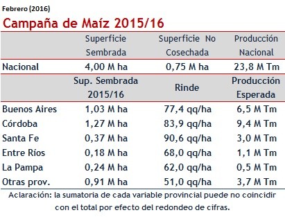 El ajuste al alza en la estimación es del 1,7% respecto del guarismo anterior (23,8 millones de toneladas), lo que deja la campaña maicera 2015/16 con 24,2 millones de toneladas de producción. Este rinde nacional se ha estimado en 74,2 qq/ha, cuando la estimación previa era de 73,0 quintales. El número de producción se compone, por ende, de esa cifra de productividad unitaria y unas 750.000 hectáreas que no entrarían a circuito comercial. El detalle puede verse en la tabla que sigue, tomándose para Entre Ríos los números de SIBER, de la Bolsa de Cereales de Entre Ríos.