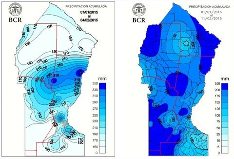 El litoral Atlántico mostró un leve calentamiento respecto del mes pasado que permitió el ingreso de humedad al sudeste bonaerense generando precipitaciones de cierta intensidad. Estas avanzan desde el sudeste de la provincia de Buenos Aires hacia la región del Saladillo y el centro de Buenos aires, alcanzando también en su incursión el oeste de la provincia y el sur de Córdoba. En este punto, al encontrarse con una zona de alta presión, las lluvias esquivan el sur de Santa Fe para escabullirse hacia la Mesopotamia. Este circuito que permite el ingreso de humedad, por su trayectoria esquiva las zonas que están más comprometidas. Aparte, mientras siga activo, no permitirá que se desactiven las altas temperaturas. Este mecanismo contribuye con lluvias del orden de los 20 a 60 mm y se potencia con el encuentro de masas húmedas aportadas por fenómeno El Niño, aumentando la capacidad de descarga (generando lluvias que pueden incluso superar los 100 mm como pasó recientemente). Aun así, estas intensas lluvias no despejan el pulso de calor, que si bien producen bajas temporarias de 8 a 10 grados, no alcanzan para disminuir el régimen térmico. Las altas tasas de radiación y el curso de los vientos preponderantes del noroeste seguirán manteniendo estas condiciones de intenso calor. Este es el problema que amenaza al cultivo, y lo está presionando en un momento perentorio, en fructificación y llenado de granos. Las lluvias que se esperan para el próximo fin de semana (12/02), tendrán este tipo de comportamiento.