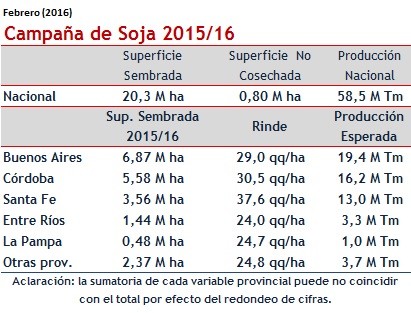 A diferencia del informe de enero en el que se trabajó con proyecciones en base a comportamientos históricos, ya es posible efectuar una estimación de rendimientos. Las condiciones bajo las cuales empezaron a definirse los rindes permiten estimar el rinde promedio en 30 quintales por hectárea a escala nacional. Sobre la base de una superficie no cosechable de 800.000 hectáreas, la producción de soja que podría obtenerse en la nueva temporada sería de 58,5 millones de toneladas.