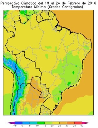 El norte y el oeste del área agrícola brasileña, observará temperaturas mínimas superiores a 20°C, con algunos focos con valores inferiores. El sudeste de Tocantins, el sur de Piauí, la mayor parte de Bahía, Goias, Mina Geraias, Paraná, Sao Paulo, Santa Catarina y el norte de Río Grande do Sul, observará temperaturas mínimas inferiores a 20ºC, con varios focos con valores inferiores.