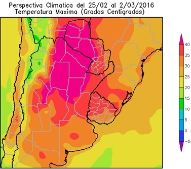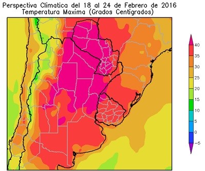 El este del NOA, la Región del Chaco, la mayor parte de Santa Fe, el norte de Córdoba, el oeste de Corrientes y la mayor parte del Paraguay, registrarán temperaturas máximas superiores a 40°C. El centro del NOA, el norte de Cuyo, la mayor parte de la Mesopotamia, la mayor parte de Córdoba, el norte de Buenos Aires, el noroeste y el sudeste del Paraguay y la mayor parte del Uruguay observarán temperaturas máximas ente 35 y 40°C.