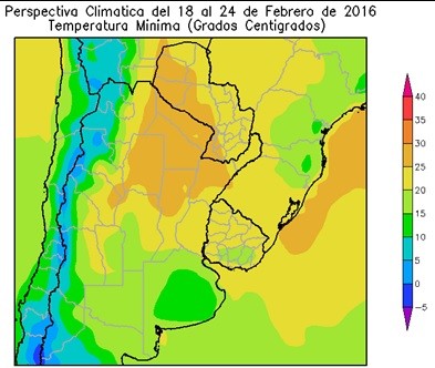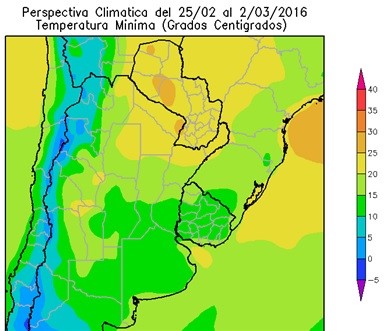 La mayor parte del Paraguay, el centro del NOA, la mayor parte de la Mesopotamia, la mayor parte de Cuyo, la mayor parte de Córdoba, el sur de Santa Fe, Entre Ríos y la mayor parte del Uruguay, observarán temperaturas mínimas superiores a 20ºC, con un foco con temperaturas superiores a 25°C. El centro-este del NOA, la mayor parte de Cuyo, la mayor parte de la Región Pampeana y el sudeste del Uruguay entre 15 y 20ºC.