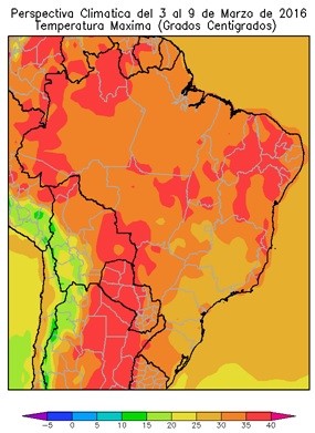 La mayor parte de los Estados de Pará, Maranhao, Bahía, Goiás, Bahía, Mato Grosso, Mato Grosso do Sul, Tocantins, Río Grande do Sul, el sur de Piauí, el norte de Mina Gerais, el oeste de Sao Paulo, el noroeste de Paraná y el oeste de Santa Catarina, observarán temperaturas máximas superiores a 30.ºC, con varios focos con valores superiores a 35°C.
