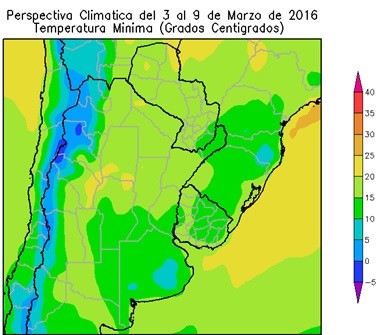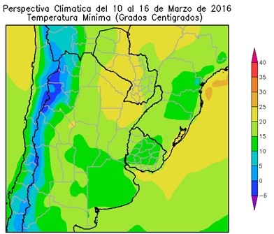 La mayor parte del Paraguay, el este del NOA, Corrientes, el centro de Cuyo, el norte de Córdoba, la mayor parte de Santa Fe, Entre Ríos, el oeste de La Pampa, el este y el oeste del Uruguay; observarán temperaturas mínimas superiores a 15ºC, con algunos focos con temperaturas superiores a 20°C. El centro del NOA, el este y el centro-oeste de Cuyo, la mayor parte de la Región Pampeana, el sudeste del Paraguay y la mayor parte del Uruguay, observarán temperaturas mínimas entre 10 y 15ºC.