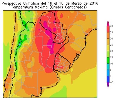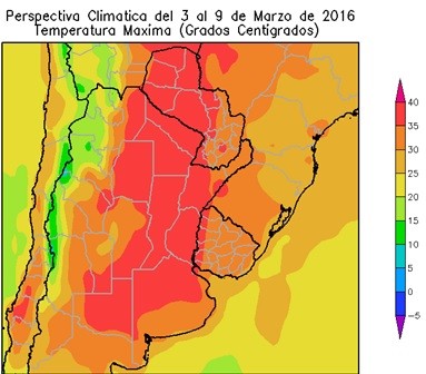 El este de Salta, la mayor parte de Santiago del Estero, la mayor parte de la Región del Chaco, la mayor parte de Santa Fe, el sur de Misiones, la mayor parte de Corrientes, de Entre Ríos, el este de Córdoba, el norte de Buenos Aires, la mayor parte del Paraguay y el oeste del Uruguay, registrarán temperaturas máximas superiores a 35°C, con varios focos con máximas superiores a 40°C. El este del NOA, el este de Cuyo, la mayor parte de Misiones, la mayor parte de la Región Pampeana, el extremo sudeste del Paraguay y la mayor parte del Uruguay, observarán temperaturas máximas ente 30 y 35°C. El oeste del NOA y el oeste de Cuyo, observarán temperaturas máximas inferiores a 20°C, con focos con valores inferiores.