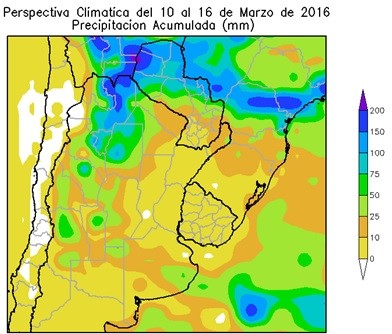 Perspectiva Agroclimática del 10 al 16 de Marzo de 2016: Precipitaciones y tormentas de variada intensidad sobre el oeste y nordeste del área agrícola y el centro de Buenos Aires, seguidas por un leve descenso térmico y la subsiguiente reactivación de la ola de calor