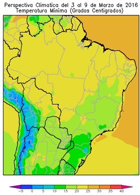 El sudeste de Tocantins, el sur de Piauí, la mayor parte de Bahía, Goiás, Mina Gerais, Sao Paulo, Mato Grosso do Sul el norte de Paraná, el este de Santa Catarina y el sudoeste y el este de Río Grande do Sul, observará temperaturas mínimas entre 15 y 10°C.