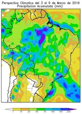 La mayor parte del área agrícola brasileña, registrará precipitaciones moderadas a muy abundantes (10 a 75 mm), con varios núcleos de tormentas con precipitaciones superiores a 150 mm), se ubicarán sobre el la mayor parte de Pará, el nordeste de Sao Paulo, sur de Goiás, el nordeste y el sur de Mato Grosso do Sul, el noroeste y el este de Sao Paulo, el sur de Mina Gerais y la mayor parte de Paraná.
