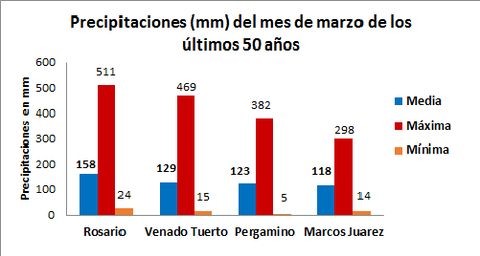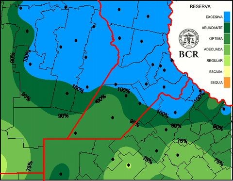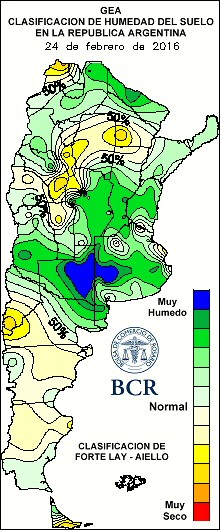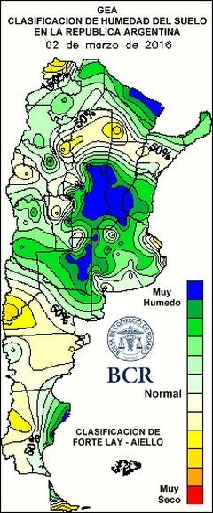 El 48% de los cuadros de maíz temprano está en el punto caramelo para su recolección pero las últimas lluvias interrumpieron el escaso avance de colecta. Con los suelos saturados es imposible pisar los lotes. El mes de febrero culminó con increíbles picos que superaron los 400 mm. Marzo comenzó con lluvias generalizadas que empeoran la situación de excesos. Los pronósticos a mediano plazo son poco alentadores, marzo será húmedo. El efecto del Niño sigue actuando en las últimas etapas de desarrollo de los cultivos. Para marzo, la precipitación media en los últimos 50 años es de 132 mm en la región. Podríamos suponer por el efecto del Niño un 30% más, o sea 172 mm mensuales, pero con la actual dinámica de la atmosfera es difícil saber qué nos depara marzo. El ambiente húmedo no sólo retrasa las labores de recolección en maíz sino que también expone al cultivo al riesgo pérdidas de calidad de grano por vuelvo y enfermedades. Pese a esto, se mantienen las expectativas de rindes en rangos de 70 a 120 qq/ha.