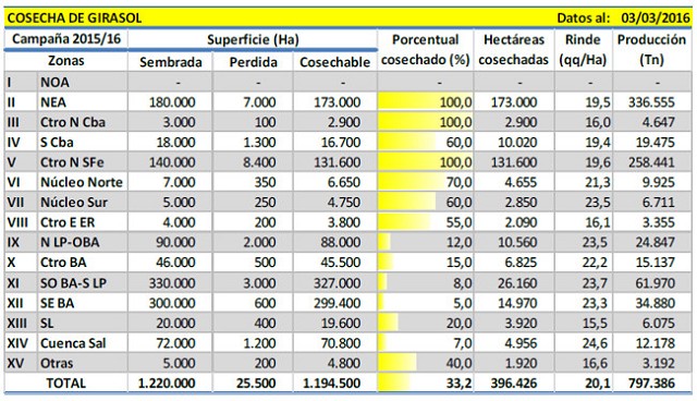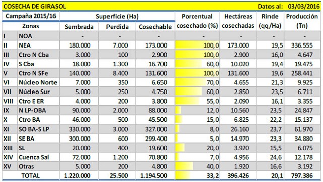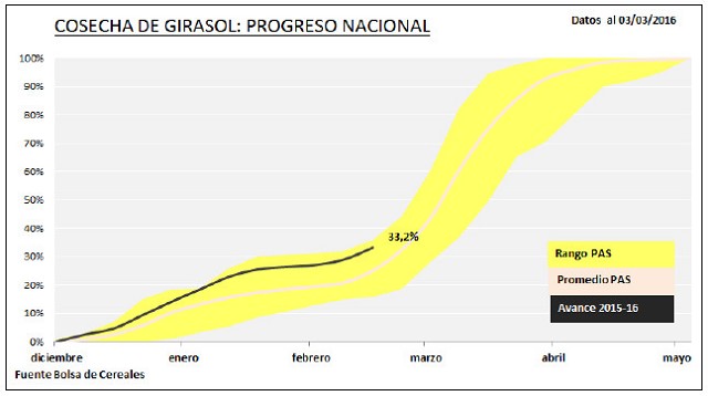 Por otro lado, en el Norte de La Pampa-Oeste de Buenos Aires, la recolección de girasol se encuentra demorada por las precipitaciones ocurridas durante las últimas semanas que demoraron el secado de los cuadros. Los mayores progresos de trilla en esta región se registraron sobre el noreste de La Pampa, donde los rendimientos obtenidos se ubicaron por encima de las expectativas iniciales, aunque aumentaron las pérdidas sufridas por excesos hídricos ocurridos durante la etapa de floración.