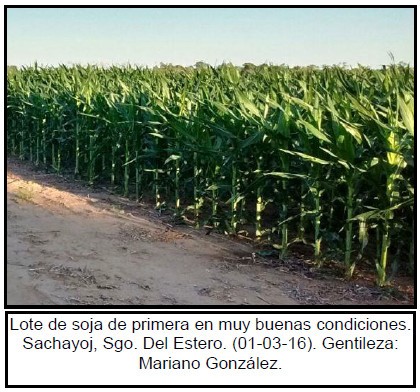 La prevalencia de ambientes humedad favorece el desarrollo de enfermedades tales como roya y tizón, a su vez se ha ido incrementando la presencia de isocas. La imposibilidad de transitar cuadros y caminos por falta de piso demora los controles sanitarios en casi todas las zonas agrícolas del país. Pese a esto último la condición del cultivo varía de buena a muy buena, tanto en lotes implantados en fechas tempranas que se encuentran finalizando su ciclo, como así también en cuadros implantados en fechas tardías que transitan etapas criticas bajo condiciones hídricas entre adecuadas a óptimas.