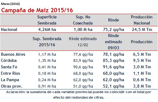 También el maíz se consolida con mejoras en los rindes, pese a que suma lotes que no ingresarían al circuito comercial. La estimación de producción asciende a 24,5 Mt. En Córdoba, Santa Fe y Buenos Aires se consolidan las expectativas de rendimiento. Santa Fe está muy próxima a los 92 qq/ha en promedio; Córdoba subiría un quintal y medio a 85,3 qq/ha y Buenos Aires aumentaría casi 1 quintal para promediar 78,1 quintales. Se realizaron ajustes en el hectareaje perdido, y en la superficie total sembrada por lo que quedarían un millón de ha por fuera de la cosecha a comercializar sobre un total de 4,26 M de ha sembradas.