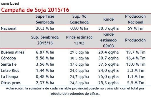 De entre varias regiones afectadas por las extensas lluvias convectivas, en este año es la provincia de Santa Fe la que estuvo jaqueada por los registros de lluvias de febrero. Máximos de 300 a 350 mm en el centro y sur de Santa Fe plantean serios problemas de logística ante la inminente cosecha. También Córdoba se ha visto muy afectada; allí estarían comprometidas unas 250 mil ha de soja que podrían no ser recolectadas por los excesos hídricos. Santa Fe podría sumar 110 mil ha. Buenos aires también está muy afectada en algunas regiones, con lo cual, a nivel país, las pérdidas estarían en el orden de 800 mil hectáreas de soja. Pese a ello, se afianzó el escenario de alta productividad de la oleaginosa. Las zonas no afectadas de Santa Fe, Córdoba y el oeste bonaerense se aproximan a los máximos rindes históricos y compensarían las reducciones por superficie. Por lo tanto, teniendo en cuenta un rinde nacional promedio de 30,3 qq/ha, apenas tres décimas de quintal más que en el informe anterior, la producción de soja se estima en 59 millones de toneladas.