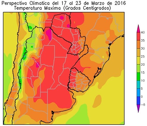 El comienzo astronómico del otoño tendrá lugar en las primeras horas del Domingo 20 de Marzo, aunque las condiciones meteorológicas continuarán siendo de corte estival durante cierto tiempo adicional. En el comienzo de la perspectiva, los vientos del norte harán sentir su influencia sobre la mayor parte del área agrícola, aportando abundante humedad atmosférica y nubosidad, y causando un ascenso térmico que se reflejará en las temperaturas máximas. Paralelamente, se producirá el paso de un frente de tormenta, observándose precipitaciones abundantes, con focos de tormenta, sobre la mayor parte de la Mesopotamia, el norte y el sur del NOA, la mayor parte del Uruguay y gran parte del área agrícola paraguaya, mientras la mayor pare del oeste y el extremo sur del área agrícola recibirán valores escasos. A medida que se produzca el paso del frente, los vientos rotarán al sector sur/sudeste, provocando un marcado descenso térmico. Todo el oeste y el sudeste del área agrícola argentina observarán temperaturas mínimas por debajo de 10°C, con leve riesgo de heladas localizadas sobre las serranías bonaerenses.