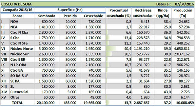 A pesar de las abundantes lluvias relevadas durante los últimos siete días, la cosecha nacional logró cubrir el 13,7 % del área apta, reflejando un retraso interanual de 0,1 puntos porcentuales y permitiendo calcular un avance intersemanal de 6 puntos. Luego de recolectarse poco menos de 2,7 MHa, el rinde medio nacional se ubicó en 37,2 qq/Ha, ubicándose -3,3 qq/Ha por debajo al rinde medio nacional relevado a similar fecha del ciclo previo. La producción nacional acumulada a la fecha ya supera las 10 millones de toneladas y se prevé que al cierre del ciclo alcance las 60.000.000 de toneladas durante la campaña en curso.