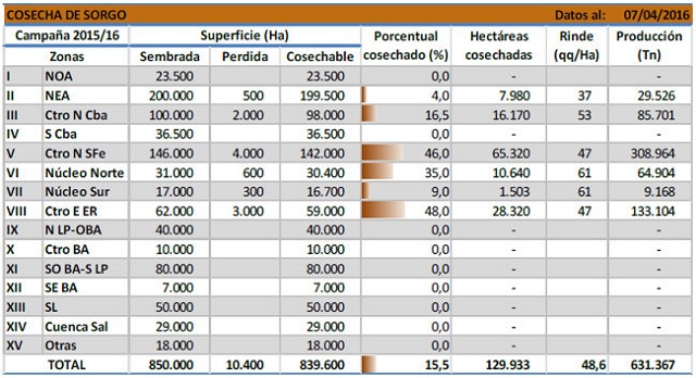 A pesar de haber sido interrumpidas durante la última semana a causa de las lluvias, las tareas de cosecha de sorgo granífero con destino grano comercial avanzaron con fluidez durante los últimos días de marzo. Gran parte de los cuadros sembrados durante los meses de noviembre y principios de diciembre han alcanzado la madurez fisiológica y en cuanto pierdan la humedad suficiente como para ser comercializados, estarán disponibles para la recolección. Al presente informe se han cosechado 130.000 Ha, las cuales representan el 15,5 % de la superficie apta a nivel nacional. La siembra de sorgo durante esta campaña fue de 850.000 Ha y el rendimiento se calcula en 48,6 qq/Ha, 2,2 qq/Ha sobre el rinde publicado durante el informe previo. La causa del aumento en el rendimiento promedio de cosecha es el avance sobre sectores del Centro-Norte de Córdoba y el Núcleo Norte, regiones que entregaron rendimientos de 53 y 61 qq/Ha respectivamente. Bajo este escenario mantenemos nuestra proyección productiva en 3.600.000 toneladas para la campaña en curso, de las cuales se han cosechado hasta el momento 631.000 Tn.