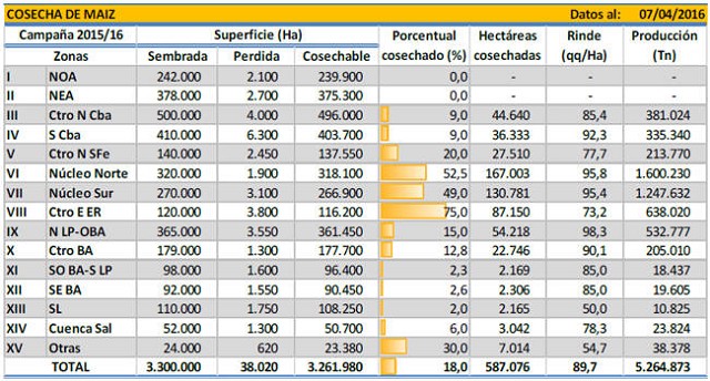 Durante la última semana la cosecha de cuadros de maíz con destino grano comercial se vio ralentizada en el centro y sur del territorio nacional por las últimas precipitaciones. La recolección avanzó fundamentalmente sobre lotes tempranos en las provincias de Córdoba, Bs. As. y los Núcleos tanto Norte como Sur. La trilla de lotes implantados durante la primavera culminó en las zonas del Centro-Norte de Santa Fe y el Centro-Este de Entre Ríos. La recolección registró un progreso intersemanal de 5,1 puntos porcentuales, elevando el área cosechada al 18 % de la superficie apta a nivel nacional. En número absolutos se lograron recolectar unas 590 mHa, que arrojaron un rinde medio a nivel nacional de 89,7 qq/Ha. Bajo este escenario mantenemos nuestra proyección de producción en 25.000.000 de toneladas para la campaña en curso.