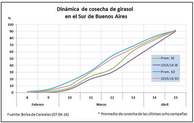 Por otra parte, en los días previos a este informe se dio por finalizada la cosecha en el Norte de La Pampa-Oeste de Buenos Aires, donde el rendimiento medio logrado fue de 22,5 qq/Ha, un 11 % inferior a la campaña pasada. En números absolutos se alcanzó un volumen superior a las 190.000 toneladas. En el Centro de Buenos Aires sólo resta recolectar los últimos lotes tardíos de girasol, que ya se encuentran en madurez fisiológica. En la localidad de Daireaux se relevaron pérdidas por anegamiento de cuadros durante las etapas de llenado de grano, pero sin embargo se lograron rindes que variaron entre 19 qq/Ha y 30 qq/Ha. Por último, en el Sudoeste de Buenos Aires-Sur de La Pampa la cosecha cobró mayor fluidez en la última semana, donde se incorporaron a la trilla lotes puntuales de segunda ocupación, principalmente en la localidad de Coronel Suárez.