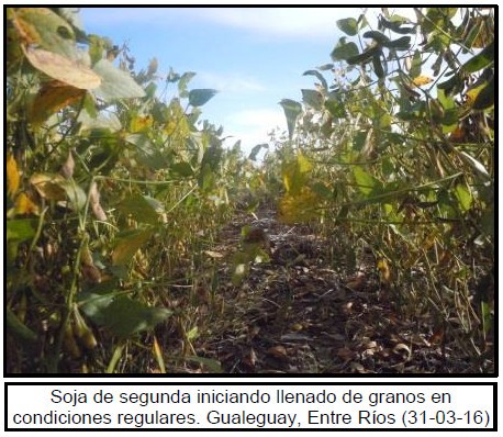 Sobre la región del Centro-Norte de Santa Fe los cuadros tardíos y de segunda ocupación se encuentran transitando la fase final del llenado de granos, con expectativas de rendimiento por sobre el promedio histórico. Hacia la región Centro-Este de Entre Ríos y la provincia de Corrientes, las tormentas de los últimos días provocaron anegamientos e inundaciones en los lotes. A la fecha no se ha podido cuantificar las pérdidas por este fenómeno en los cuadros tardíos. Por otro lado, la trilla de cuadros tempranos finalizó con rindes que oscilaron entre 50 y 90 qq/Ha. Por otro lado, los lotes tardíos se encuentran transitando estadíos entre grano lechoso (R3) y grano duro (R5).