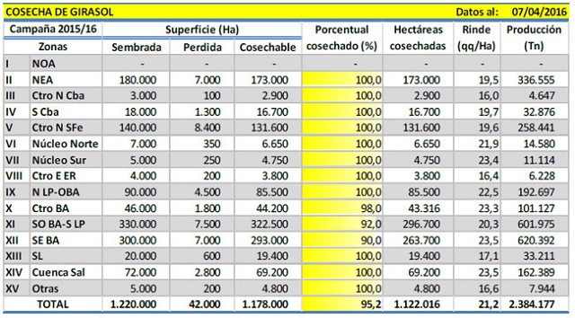 La cosecha de girasol se encuentra próxima a culminar, restando recolectar lotes puntuales en las regiones Centro de Buenos Aires, Sudoeste de Buenos Aires-Sur de La Pampa y Sudeste de Buenos Aires. El progreso de trilla alcanzó el 95,2 % de la superficie apta, luego de registrar un progreso intersemanal de 8,9 puntos porcentuales con un rinde medio nacional de 21,2 qq/Ha y un volumen parcial acumulado en chacra cercano a las 2,4 MTn. Durante las últimas semanas, los rendimientos obtenidos en los núcleos girasoleros del sudeste y sudoeste de Buenos Aires, regiones que aportaron en conjunto el 51 % del área implantada, continuaron ubicándose ampliamente por encima de las expectativas al inicio de la cosecha. En consecuencia, este aumento en el volumen permite elevar nuestra proyección a 2.500.000 toneladas para la campaña en curso, un 2 % superior a nuestra última publicación. De concretarse esta nueva cifra, no se registraría variación en comparación al ciclo previo, principalmente debido a un incremento interanual de la superficie implantada del 3,4%, pero acompañado de un menor rinde promedio estimado a ser logrado sobre el final de la trilla (Rendimiento Medio 14/15: 22,1 qq/Ha). A su vez, los principales incrementos de área para la campaña 2015/16 se registraron en el NEA y Centro-Norte de Santa Fe, las cuales no aportan gran volumen a nivel nacional debido a su potencial de rendimiento. En contraposición, regiones con mayor participación en el área nacional implantada con girasol como el Sudeste de Buenos Aires, no sufrió variación interanual de superficie y el rinde proyectado a fin de campaña se ubicaría por debajo del obtenido en el ciclo previo.