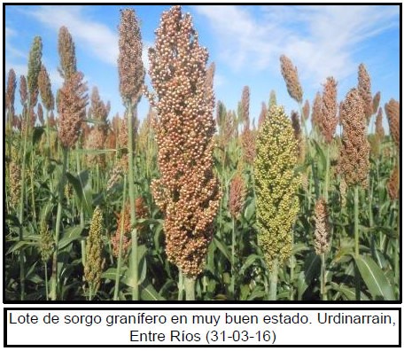 A nivel nacional, alrededor de la mitad de los lotes de sorgo ya han alcanzado la madurez fisiológica y se encuentran a la espera de que los granos pierdan humedad para poder ser cosechados en condiciones. Luego, un 45 % de los lotes se encuentran transitando la fase de llenado de grano y aún existe un 5 % de cuadros sembrados muy tarde que transitan fin de floración en buenas condiciones. En comparación al informe previo, se observa que una mayor proporción de los cuadros evoluciona bajo condiciones favorables, probablemente asociadas a la ocurrencia de lluvias en sectores donde los perfiles habían disminuido sus reservas.