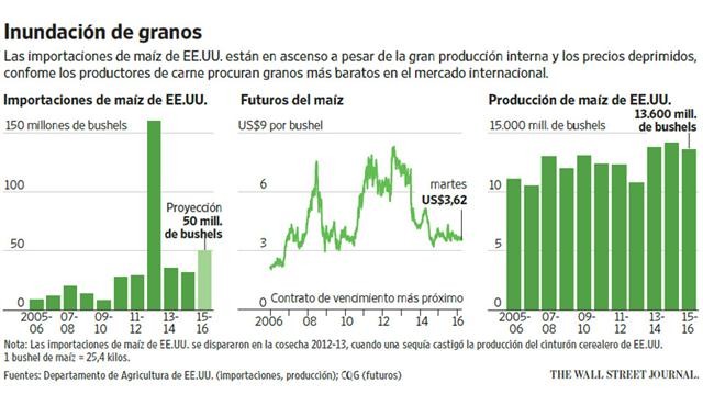 Las importaciones de maíz argentino crecieron 122% durante ese lapso, después que el nuevo gobierno encabezado por Mauricio Macri, que asumió en diciembre, levantó los controles de divisas (lo cual provocó una devaluación del peso) y eliminó los impuestos a la exportación de maíz y otros productos agrícolas. Los exportadores argentinos ofrecieron su maíz con un descuento de cerca de 6% respecto de los precios de sus competidores estadounidenses durante este año, mientras que el maíz brasileño fue más barato que el de EE.UU. durante buena parte del año pasado.