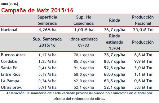 Los ajustes positivos que más se destacan fueron los de las provincias de La Pampa y Córdoba, llevándolos a 65,8 qq/ha (3,8 quintales más que en la estimación de marzo) y 88,7 qq/ha (3,4 quintales más), respectivamente. En Santa Fe los rindes cosechados y las expectativas se ajustan con 1,2 quintales más. En Buenos Aires, el potencial de maíces siembra temprana y tardía posibilita incrementar en más de medio quintal el rinde unitario a nivel provincial. Se resumen los datos por provincia en el cuadro que sigue.