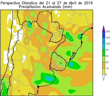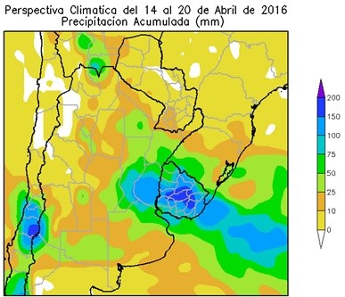La mayor parte del área triguera, del Delta y el sur de la Región del Sudeste, observarán precipitaciones entre moderadas a muy abundantes, con varios núcleos de tormenta con precipitaciones superiores a 100 mm, manteniendo la humedad del suelo entre abundante a excesiva, para los cultivos de verano. La mayor parte del cinturón maicero y la mayor parte de la Región del Sudeste, observarán precipitaciones escasas.
