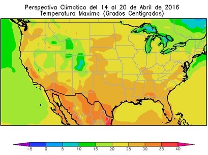 La mayor parte de Dakota del Norte, Nebraska, Kansas, el norte y el sudeste de Dakota del sur, el noroeste y nordeste de Oklahoma, la mayor parte del cinturón maicero, el norte y el este de la Región del Sudeste y norte de Arkansas, registrará temperaturas máximas superiores a 20ºC, con algunos focos con valores superiores.