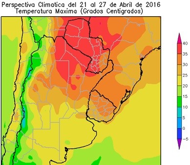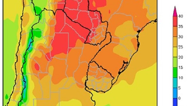 El este del NOA, el sur de la Región del Chaco, la mayor parte de la Mesopotamia, el norte de Córdoba, la mayor parte de Santa Fe, el sudeste del Paraguay y el norte del Uruguay, registrarán temperaturas máximas superiores a 30°C, con varios focos con valores superiores a 35°C.