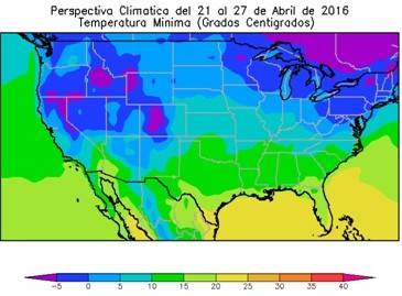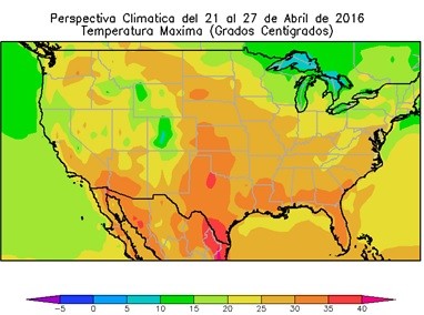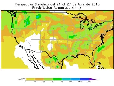 En el inicio de la perspectiva, los vientos rotarán al sector sur, causando temperaturas máximas superiores a lo normal, en la mayor parte del área agrícola norteamericana, a excepción de su extremo nordeste. Nevada intensa en las Sierras; 22 de Abril: Temperaturas muy por encima de lo normal para el norte del Oeste Intermontañoso; 25-26 de Abril: Temperaturas muy por encima de lo normal para el sudeste; Posibles inundaciones ocurriendo en sectores del Sur de las Planicies.