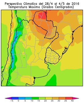 El centro del NOA, el norte de Cuyo, la mayor parte de Córdoba, el norte de Entre Ríos, el sur de Corrientes y el norte de la República Oriental del Uruguay, observará temperaturas máximas entre 25 y 30°C. El centro-este del NOA, la mayor parte de Cuyo, la mayor parte de la Región Pampeana y la mayor parte del Uruguay, observarán temperaturas máximas entre 20 y 25C.