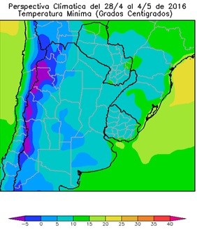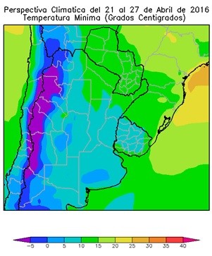 El norte del cinturón maicero, observará temperaturas mínimas inferiores a 0º.C, con focos con valores inferiores. El norte del área triguera y el centro del cinturón maicero, registrarán temperaturas mínimas entre 0 y 5°C. El sur del área triguera, la mayor parte del Delta y la mayor parte de la Región del Sudeste, observarán temperaturas mínimas entre 10 y 15ºC.