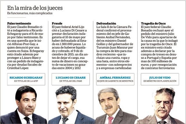 La avanzada de la justicia federal contra ex funcionarios del kirchnerismo alcanzó ayer un nuevo pico con la citación a indagatoria a Ricardo Echegaray -ex titular de la AFIP y actual presidente de la Auditoría General de la Nación- y a Luciano Di Cesare, ex titular del PAMI.