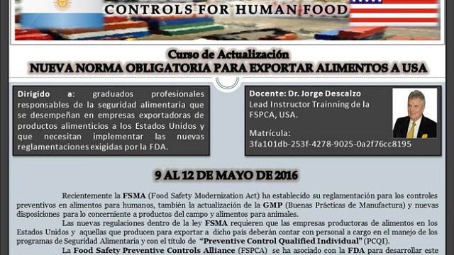 Dirigido a: graduados profesionales responsables de la seguridad alimentaria que se desempeñan en empresas exportadoras de productos alimenticios a los Estados Unidos y que necesitan implementar las nuevas reglamentaciones exigidas por la FDA.