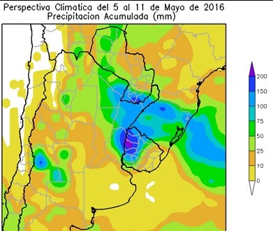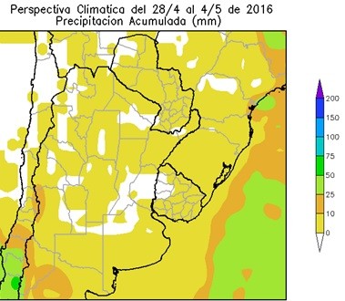 La mayor parte del área agrícola paraguaya, la mayor parte del área agrícola argentina y la mayor parte del área agrícola de la República Oriental del Uruguay, observarán precipitaciones escasas (menos de 10 mm) con algunos focos con valores moderados.