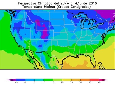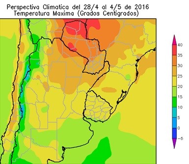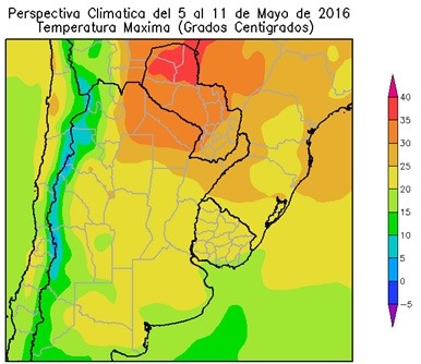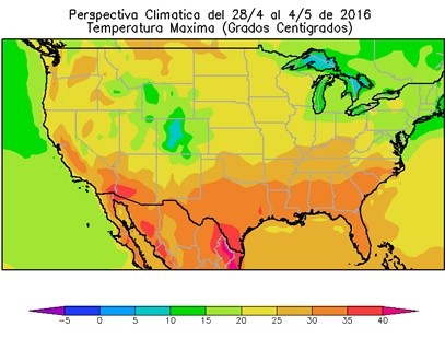 La perspectiva comenzará con vientos del sector sur, que provocarán un marcado ascenso térmico en el sur del área agrícola norteamericana, mientras que el centro y el norte registrarán valores más moderados. La mayor parte del área triguera y la mayor parte del cinturón maicero, registrará temperaturas máximas superiores a 20ºC, con algunos focos con valores inferiores.