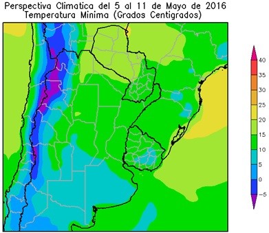 Al comienzo de la perspectiva continuará entrando la masa de aire frío que arribó en los días precedentes, acentuando el descenso térmico, en la mayor parte del área agrícola, con riesgo de heladas localizadas y generales. La Región Occidental del Paraguay, el este del NOA, la mayor parte de la Región del Chaco, el noroeste de Santa Fe, el centro de Cuyo, el este y el sur de Buenos Aires, la mayor parte de La Pampa y el este y el sur del Uruguay, registrarán temperaturas mínimas entre 10 y 5°C, con leve riesgo de heladas localizadas.