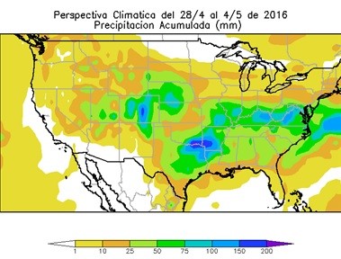 La mayor parte del área triguera, la mayor parte del cinturón maicero, la mayor parte del Delta y la mayor parte de la Región del Sudeste, registrarán precipitaciones moderadas a muy abundantes, observándose dos núcleos de tormenta con precipitaciones superiores a 150 mm, que se ubicarán sobre el sudeste de Oklahoma y el sudoeste de Arkansas, manteniendo la humedad del suelo entre abundante a excesiva, para los cultivos de verano.
