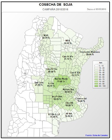 Durante los días previos, los mayores progresos de cosecha se han concentrado en las zonas más demoradas del centro de la región agrícola. Es por ello que la región Núcleo Norte, ha registrado un progreso intersemanal de 28,7 puntos porcentuales, elevando el área recolectada al 75,4 % del área apta. El rinde promedio en lotes de primera se ubicó en 29,6 qq/Ha, valor que permite calcular una reducción de -25,1 % respecto al promedio de 39,5 qq/Ha registrado previamente al inicio de las fuertes lluvias de abril.