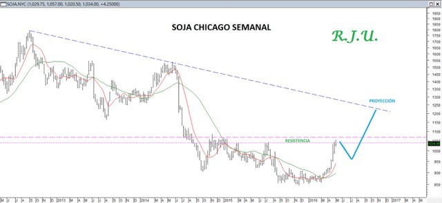 Si esta apreciación analítica es correcta, creemos que independientemente de recortes parciales que puedan habilitarse de corto plazo al avance de los últimos dos meses para la soja, los cuales incluso podrían llevarla de regreso de los niveles actuales hacia la zona de 980-950 cent/bu (350-360 u$s/tn), creemos que finalmente luego el avance del commodity quedaría retomado, buscando objetivos de recuperación en Chicago en torno a los 1200-1250 cent./bu (440-460 u$s/tn) y de 310-330 u$s/tn en la plaza local hacia finales del presente año o bien comienzos del 2017.