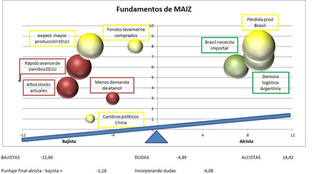 Mientras tanto comienza a ponerse el foco en el nuevo ciclo. El 10 de mayo el USDA publicará su informe de oferta y demanda mundial, con el primer balance completo para la campaña nueva. Se espera que los números de campaña nueva muestren existencias de maíz subiendo unas 10 mill.tt. y las de soja bajando apenas 1 mill.tt. Esto sería un dato negativo para el cereal y neutro para la soja.