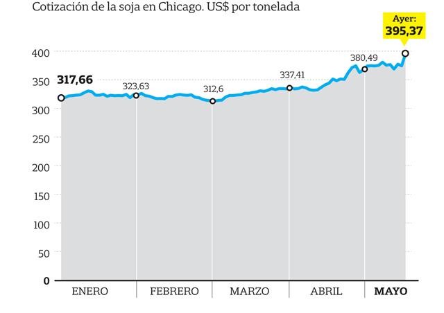 La soja voló ayer en Chicago y la cosecha argentina de la oleaginosa se valorizó en un solo día en US$ 900 millones. De mantenerse las cotizaciones en estos niveles, se neutralizaría, al menos en parte, la pérdida de divisas que causaron las inundaciones en la pampa húmeda.