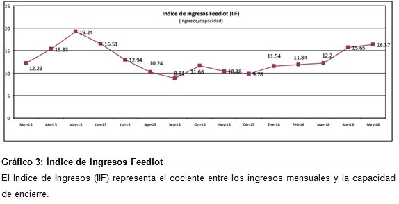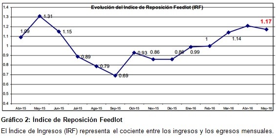 El inicio de mayo nos muestra una ocupación de los corrales de un 60 %, registrando por segundo mes un incremento del 3 % y valores similares a los del año anterior para el mismo período. Sin embargo el IRF (Índice de Reposición Feedlot), con un valor de 1,17, registró una caída respecto al mes anterior mostrando una zafra que se presenta más escalonada debido a varias causas. En parte, el buen estado forrajero de los campos genera un retraso en los destetes y que sean más pesados; por otro lado el estado de los caminos rurales durante el mes de abril complicó las cargas de invernada debido a la cantidad de días de lluvias. Asimismo los retrasos en las vacunaciones de aftosa en algunas zonas también pueden haber contribuido a esta zafra no tan marcada.