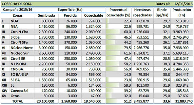 A pesar de esto último, la significativa reducción de los rendimientos en zonas fuertemente afectadas por las malas condiciones climáticas de abril, provoca la caída del rendimiento promedio nacional que al presente informe se ubica en 33,6 qq/Ha (-0,8 qq/Ha vs informe previo). Bajo este escenario, nuestra proyección de producción nacional se mantiene en 56.000.000 de toneladas y de concretarse dicha estimación reflejaría una caída interanual de -8 %, que en números absolutos equivale a una merma de 4,8 MTn en comparación al ciclo previo (Producción 2014/15: 60,8 MTn).